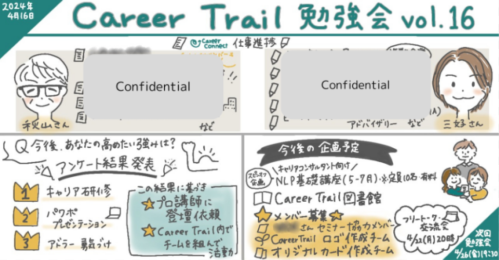 グラレコ発信で内容がより分かりやすくなりました! 投稿日: 2024年4月22日2026年3月9日 投稿者: e-career connect メンバーの宮下ゆかりさんが毎回グラレコを描いてくださいます。本人曰く、スキルアップ中とのこと。どんどん分かりやすく、伝わる内容になってきていて、すごいんです。これまではキャリアトレイル内の勉強会ログで活用させていただいていましたが、外部の皆様への発信にも載せていくことにしました!今後もお楽しみに(*^-^*)